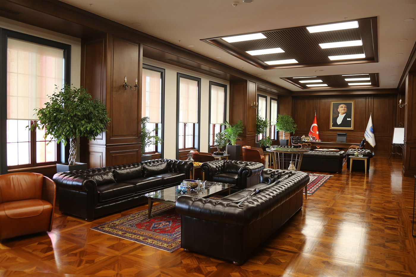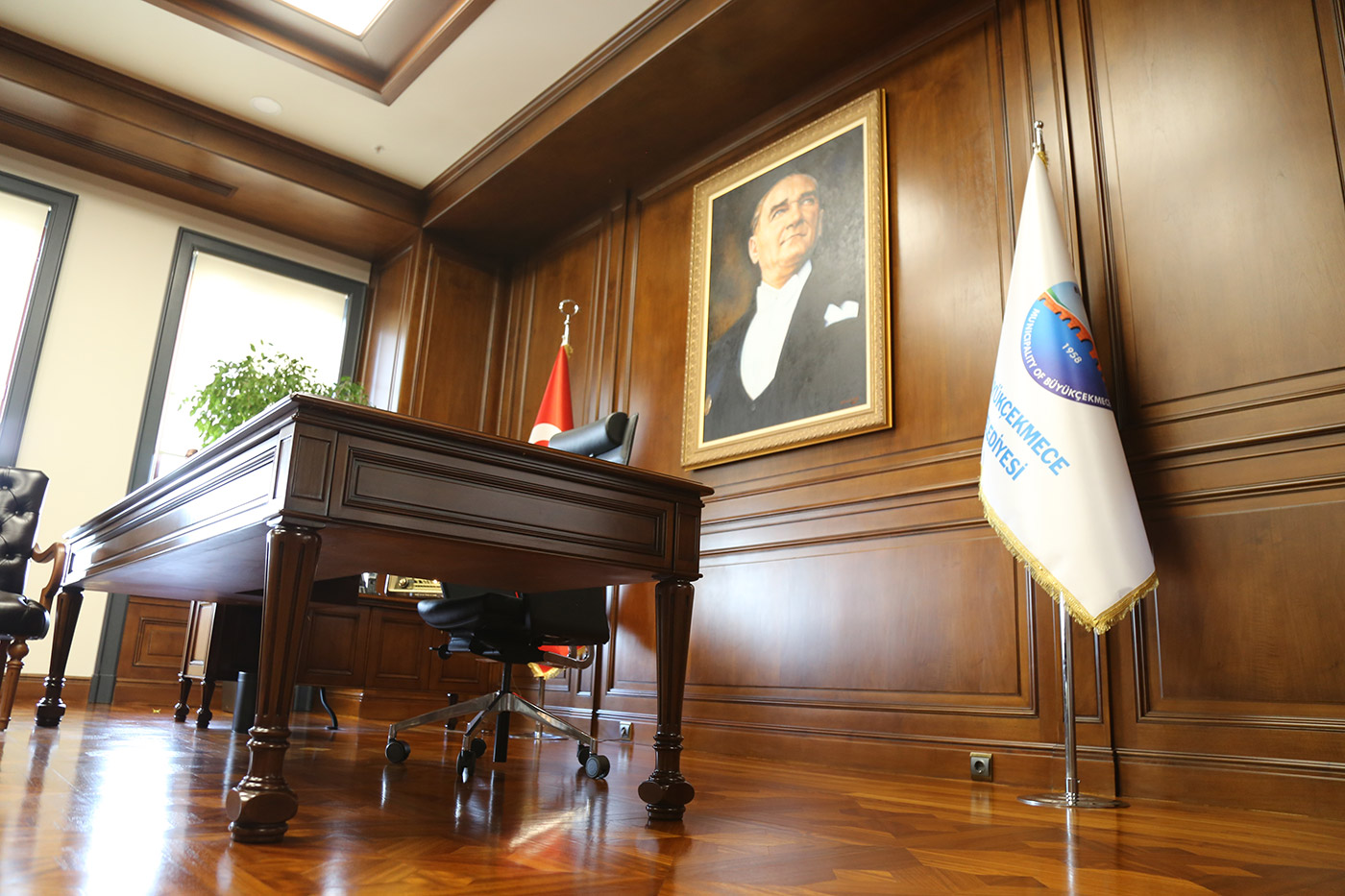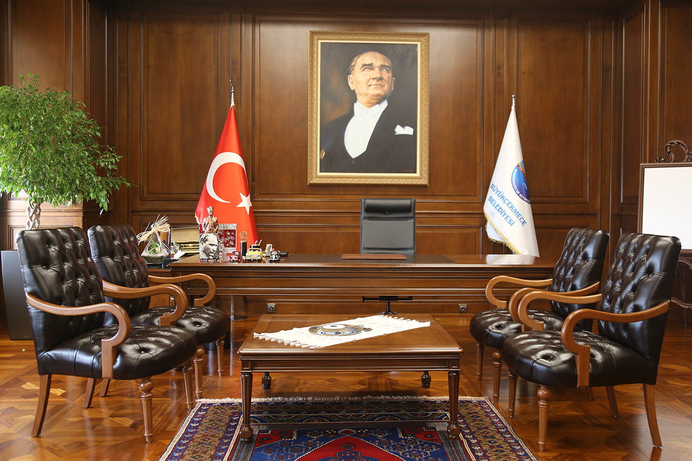 Belediye binası başkanlık katında bulunan makam odasıbekleme salonu ve toplantı odası ahşap çalışmaları tamamen Ağaç İşleri Atölye'mizde üretilmiş, ve uzman ekibimizce uygulaması yapılmıştır.