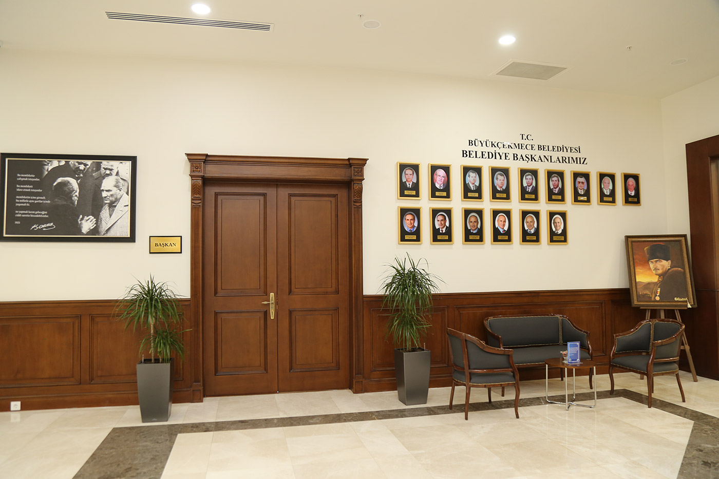 Belediye binası başkanlık katında bulunan makam odasıbekleme salonu ve toplantı odası ahşap çalışmaları tamamen Ağaç İşleri Atölye'mizde üretilmiş, ve uzman ekibimizce uygulaması yapılmıştır.